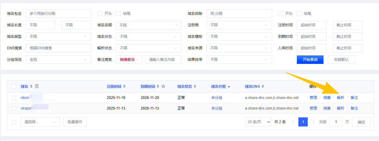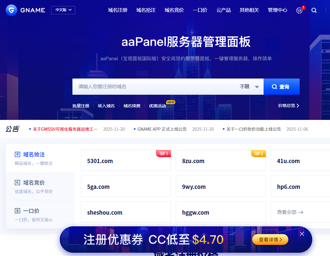 输入一个前缀查询可用域名,按价格排序,选择便宜的后缀(如.top,.xyz)即可。为了下文叙述方便,我们假设你注册域名为yourdomain.com