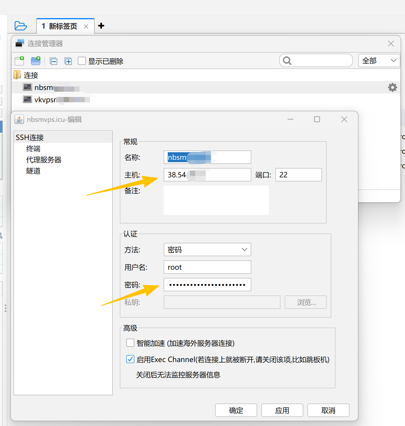 解析生效后,我们通过 SSH 管理软件(如 FinalShell、PuTTY 或 Termius)连接到 VPS 开始部署 Trojan 服务。添加一个新的连接,主机填写所购VPS的IP,用户名填写root下方的密码填写购买实例时配置的密码。如果链接有问题,试试点选下方的智能加速选项。