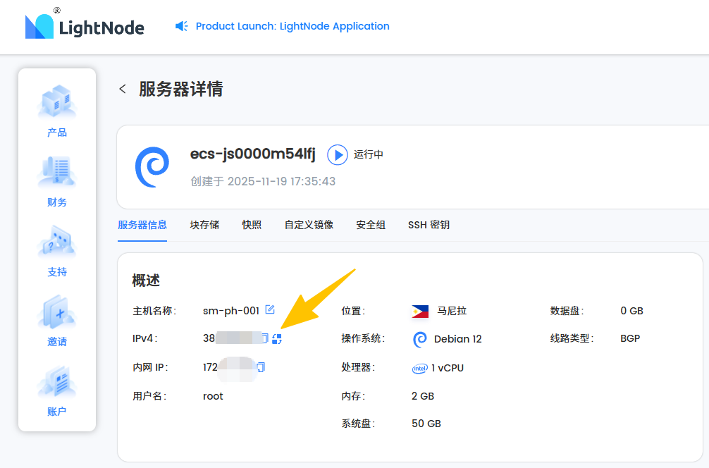 等待若干分钟,让服务器完成配置,待实例变为运行中状态后,进入管理页面,复制系统给服务器分配的公网IP地址备用。