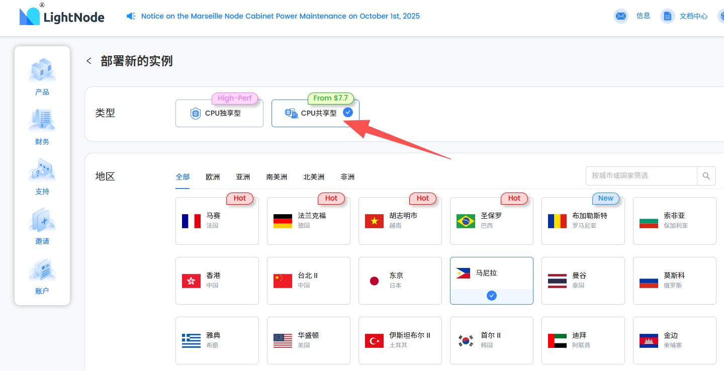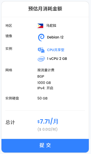 地区:按需选择节点的位置,在这个教程中我们选择了菲律宾·马尼拉