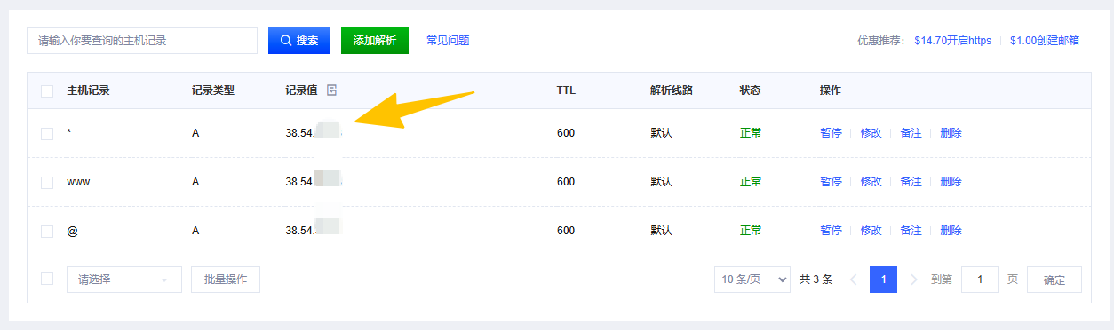 进入域名的 DNS 管理页面,我们需要将域名指向 VPS 的 IP 地址。